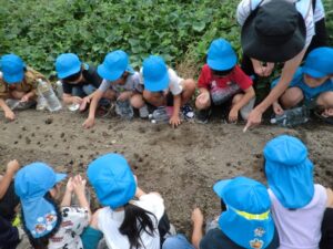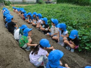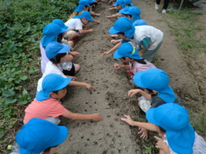 あやめ組ともも組の子どもたちが、こども園の畑に大根の種をまきました。