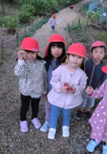 3歳すみれ組の子どもたちが園の近くのこもれび池までお散歩に出かけました。