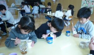 凧揚げを園庭で楽しんだ後、12月にお餅つきをした時のお餅を小さく切り、ぜんざいを給食の先生に作っていただいて、みんなでいただきました。