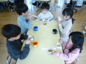 思い切り凧揚げで走った後だったので、温かくて甘いぜんざいがとても美味しくて子どもたちも満足そうな様子がみられました。
