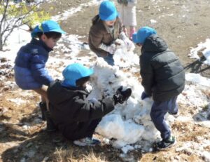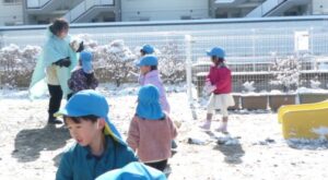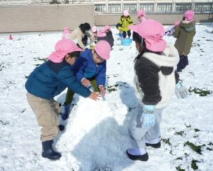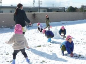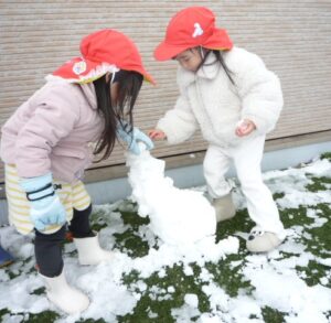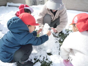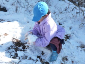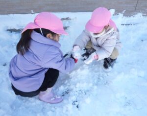 すみれ組(3歳)は「冷たいね」と言いながらも雪合戦をしたり、壁を的にして雪投げをしていました。また、雪を集めてみんなで雪だるまを作って大喜び!先生や友達と一緒に冬の自然に触れる楽しい経験になりました。