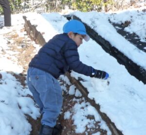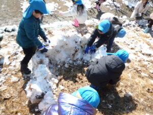 朝登園したあやめ組(5歳)の子どもたちは、早速園庭に出て友達や先生と思い切り雪合戦をしたり、雪だるまを作ったりしました。中には友達と一緒に『かまくら』を作り出す姿もあり、園庭の土手に積もった雪を集め固めていきました。5歳児は友達と同じ目的をもって協力して作る楽しさを雪遊びを通して感じているようでした。
