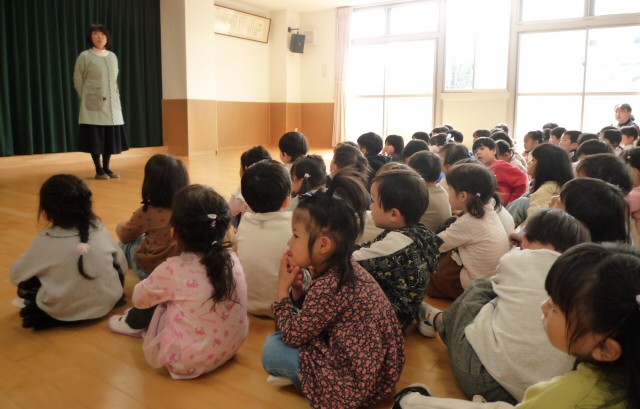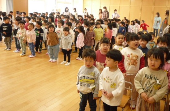 全園児が集まって、3学期の終業式を行いました。園長先生からの「話を聞く時はしっかり相手の目を見て聞く」ことや「挨拶を進んですること」、どちらもがんばれたかな?との問いかけにみんな大きな声で返事をしていました。1年でみんな大きく成長したことを振り返り、子どもたち全員で「はるがくる」の歌を元気いっぱい歌いました。4月からは一つ大きいクラスになります!みんなそれぞれに期待をもって、終業式を終わりました。