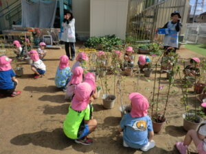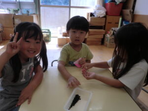 保育室に戻ると折り紙で折った種入れの袋に数えながらいれていました。「また、来年この種で植えられるね」種から芽が出て花が咲いて、また種になって次につながるんだね」と、命の大切さも感じたようです。