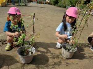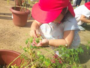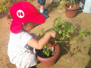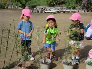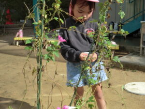 もも組(4歳)の子どもたちが植木鉢に植えた朝顔の種とりをしました。