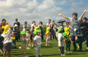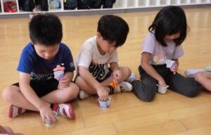 リズムは「ばなな体操」の曲に合わせて、「ひざ・かた・うえ」と声を出して踊っている子どももいました。最後のばななのポーズもとても可愛らしく、ほほえましい姿をみせてくれました。短い時間でしたが、おうちの方の一生懸命の応援に、ニコニコ笑顔で応えていた子どもたちでした。