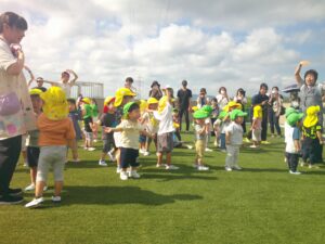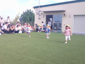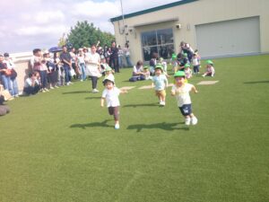 こども園の屋上でたんぽぽ組(2歳)、つくし組(1歳)の運動会をしました。