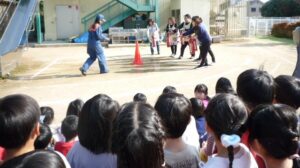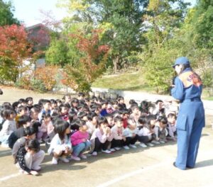 11月の避難訓練は火災を想定して避難をしました。今回は消防署の方と消防団の方に来ていただいて、子どもたちが避難する様子を見ていただいた後、職員の消火訓練を見てもらいました。子どもたちには先生たちが赤いさんかくコーンをめがけて初期消火をする様子を見て、「〇〇先生がんばれ!」と声援を送ってくれました。