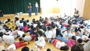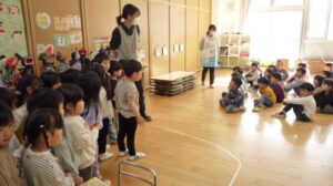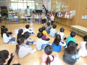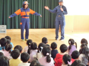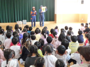 その後遊戯室で火災や災害の話を聞き、火災が起きた時は口をハンカチや手で覆い低い姿勢になることや、服に火が付いたら自分でコロコロと転がって火を消すこと、地震の時はダンゴムシのように小さくなって頭を守ることなどを教えてもらいました。実際にクイズ形式で火災や地震が起きた時の動きを、楽しく学ぶことができました。