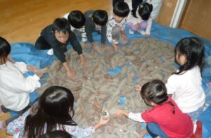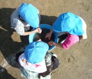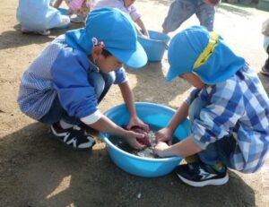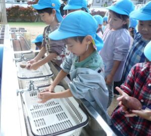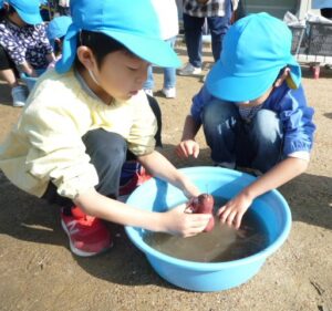 すみれ組(3歳)があやめ組(5歳)に「お芋洗いお願いします」と言うと、あやめ組の子どもたちが「わかりました。任せてください!」お兄さんお姉さんらしい対応に、頼もしさを感じました。