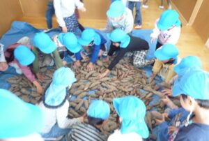 11日の焼き芋パーティーをするための準備をしようと、収穫したお芋の中から子どもたちが手ごろな大きさのものを選びました。